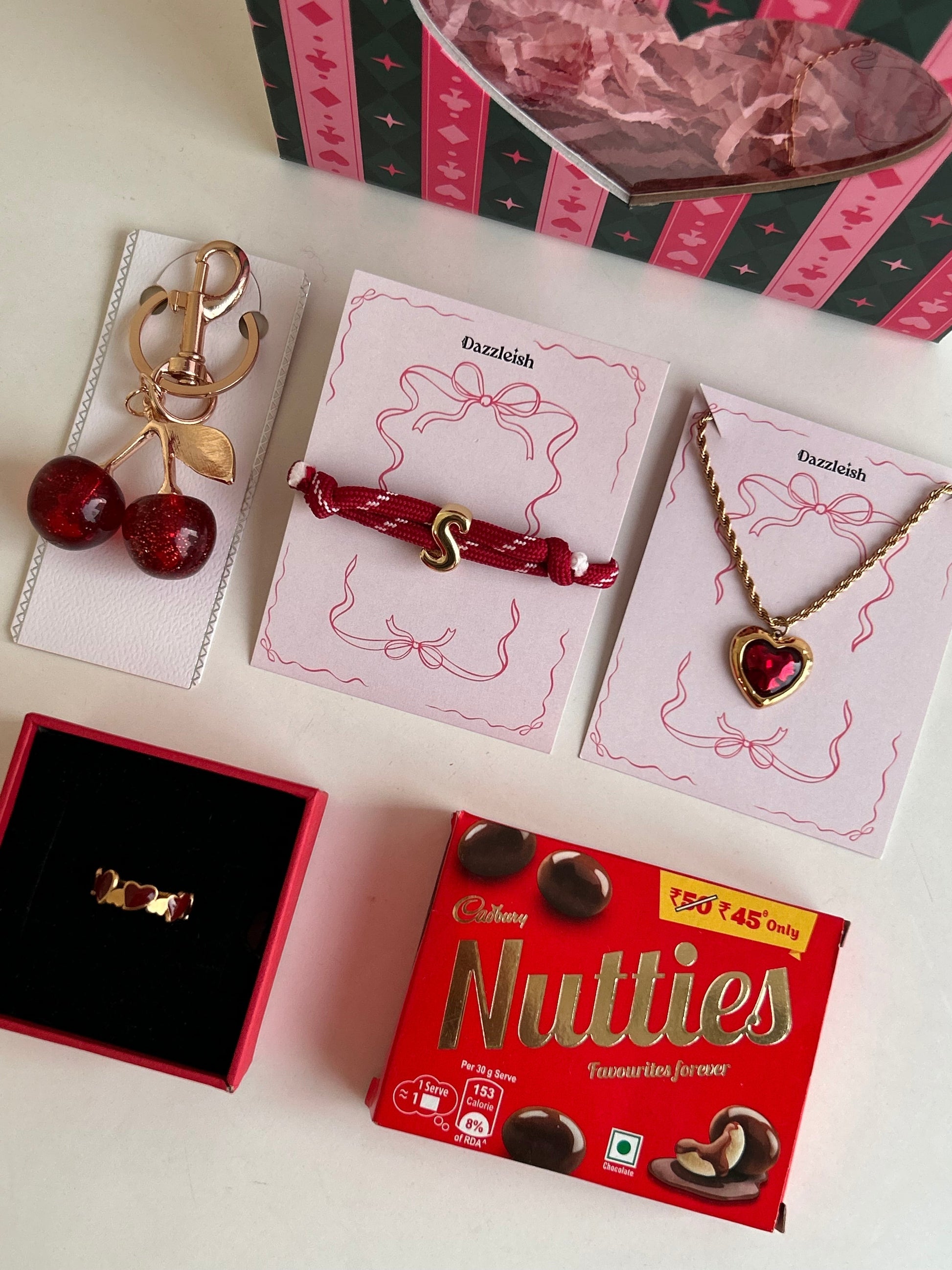 💍 Red Heart Statement Ring: An adjustable, sleek band that ensures a perfect fit without needing to know her size.